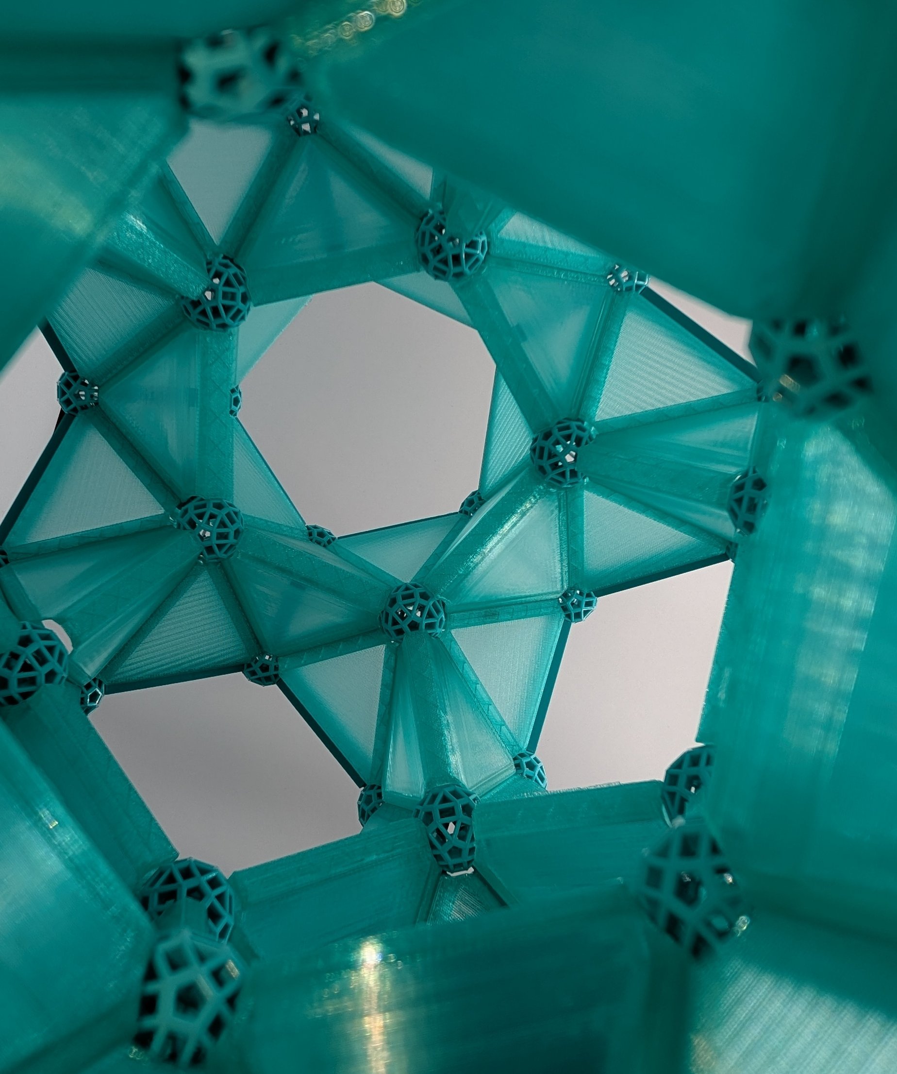 A first vZome model explains the construction. Consider an inner dodecahedron (magenta), concentric with an outer truncated dodecahedron (teal). A rhombicosidodecahedron (green) intersects the truncated dodecahedron along a decagonal face. The solid intersection is a pentagonal cupola, (Johnson solid J5). Its pentagonal face connects to a face of the dodecahedron by a pentagonal antiprism.