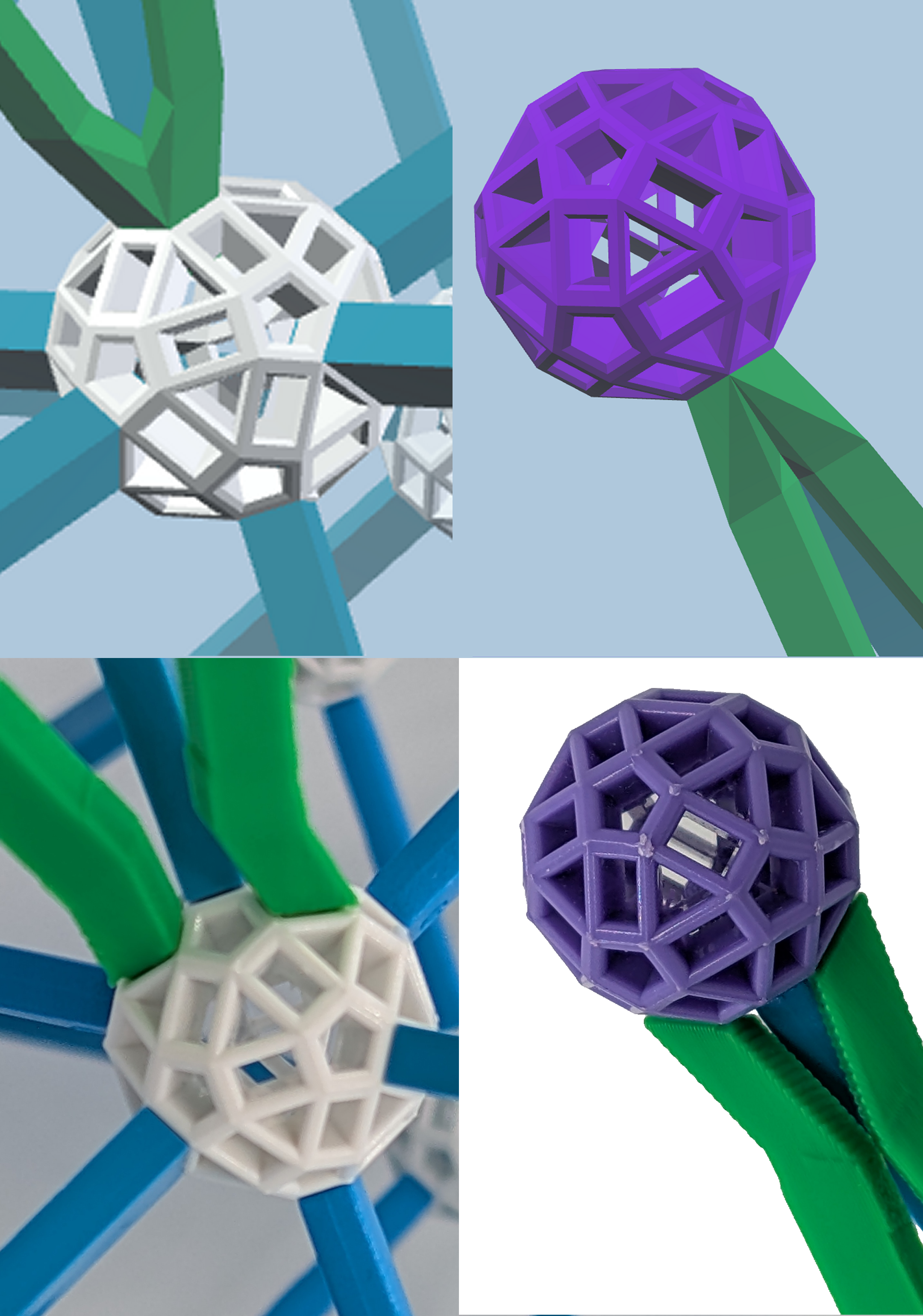 This impossibility can be bypassed by designing (see vZome and Openscad files) a modified g2 strut, as shown in the lower half of the picture: instead of bending towards a pentagonal hole, it bends in the other direction towards the neighbouring rectangular hole, at both ends of the strut. The tips of the struts are generated by vZome’s 3D Printing Starters.