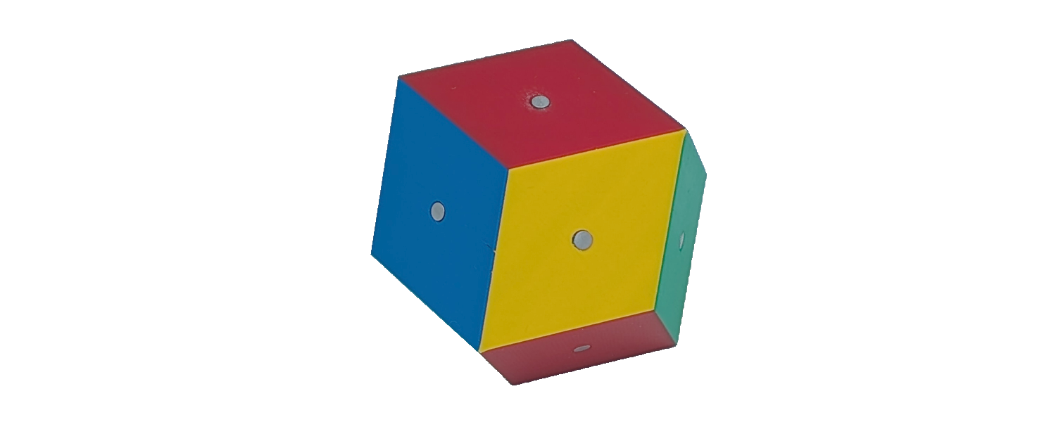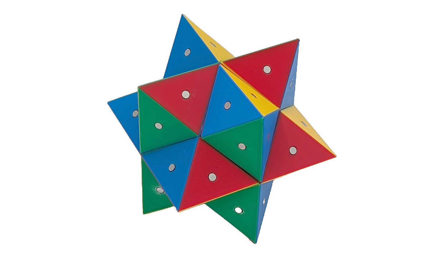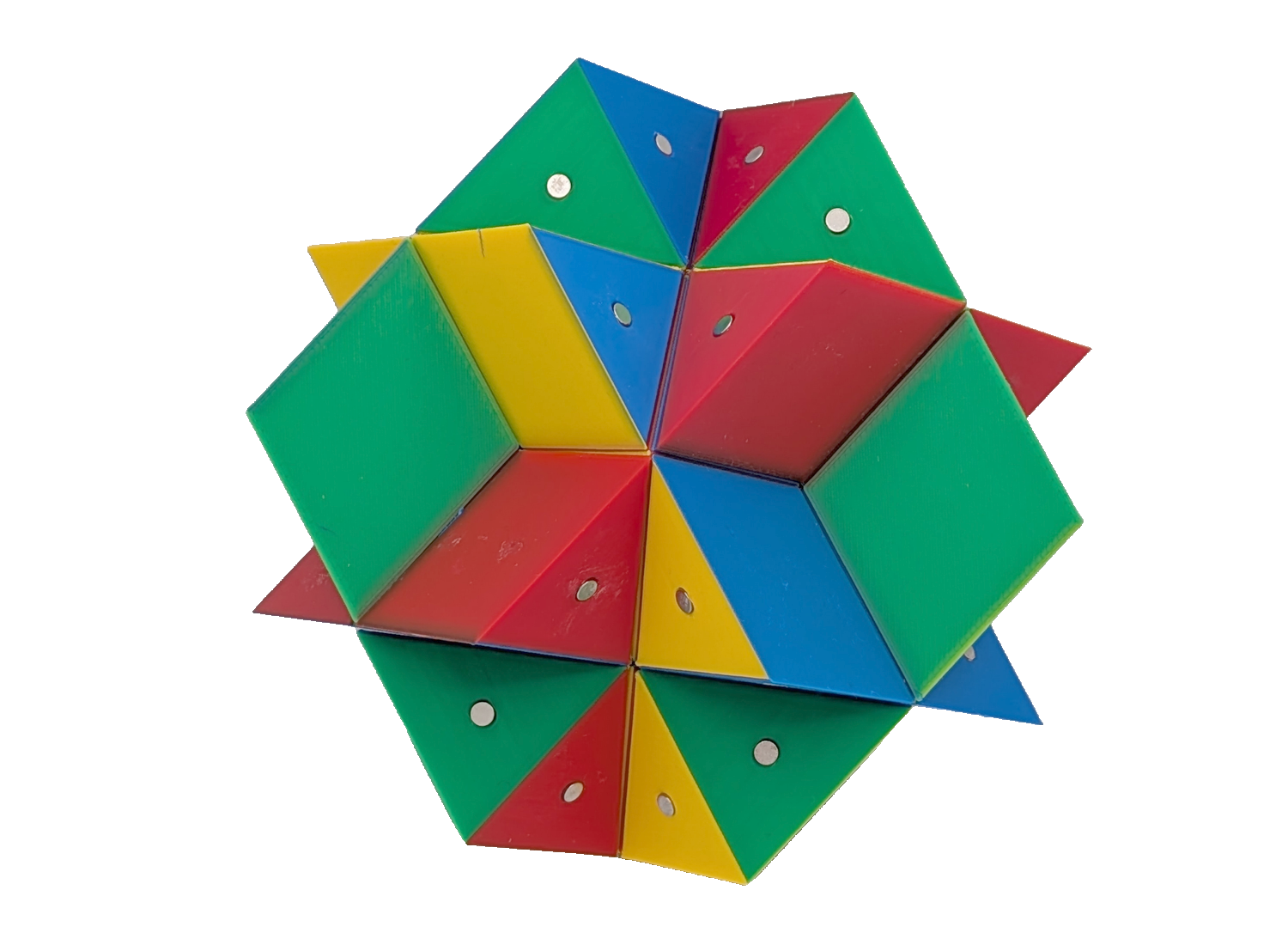 Bob Hearn had the cunning idea to produce a magnetic set of all the cells that compose all the stellations of the Icosahedron. His monochrome components were designed in Fusion 360. In order to obtain stellations which are consistently face-coloured, I created a workflow to produce pieces which are multicoloured individually. For each piece type, a vZome design is transformed by a perl program into an OpenSCAD file for all multicoloured patterns which are needed. This post presents the multicoloured magnetic set for the stellations of the Rhombic Dodecahedron.