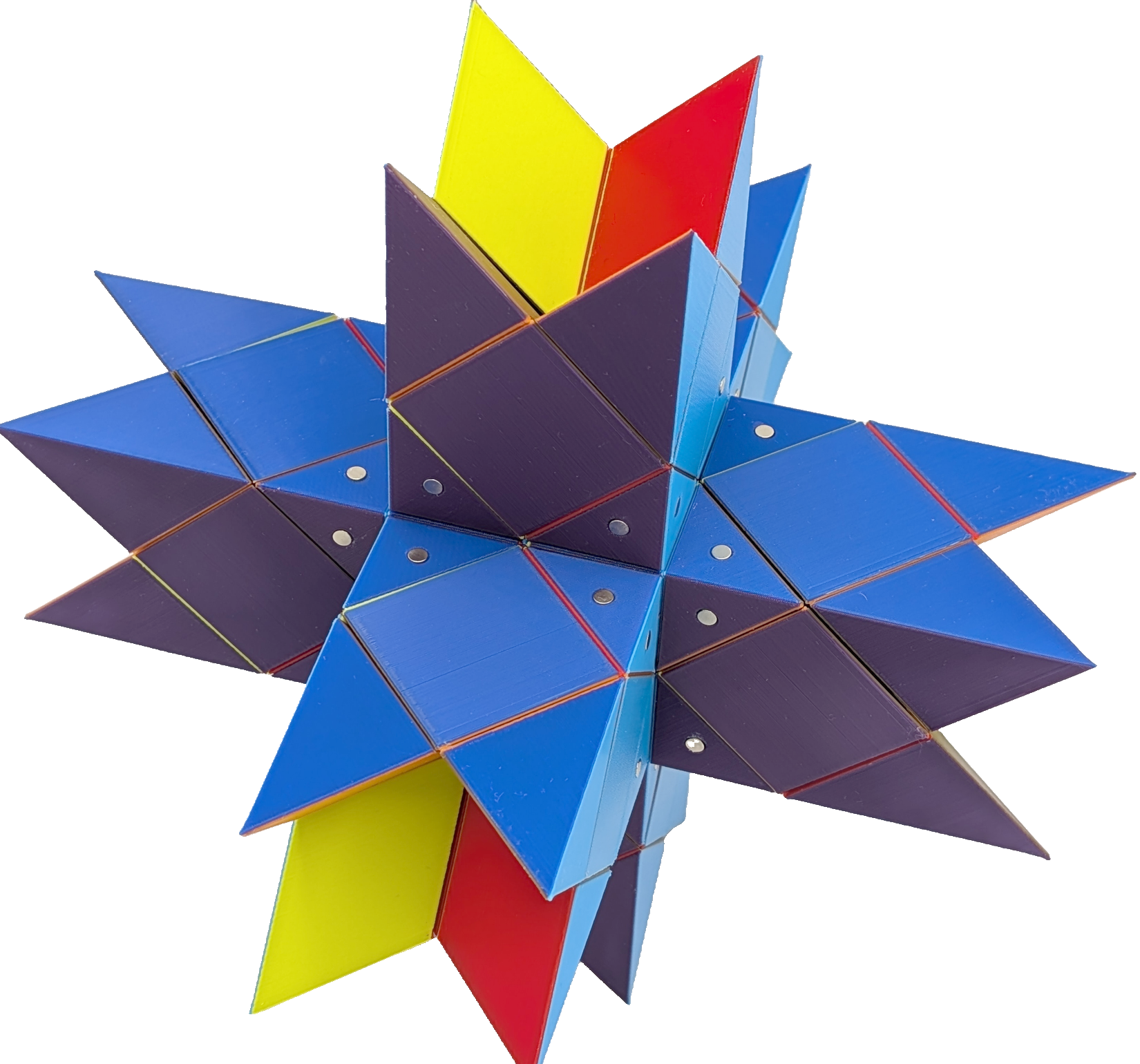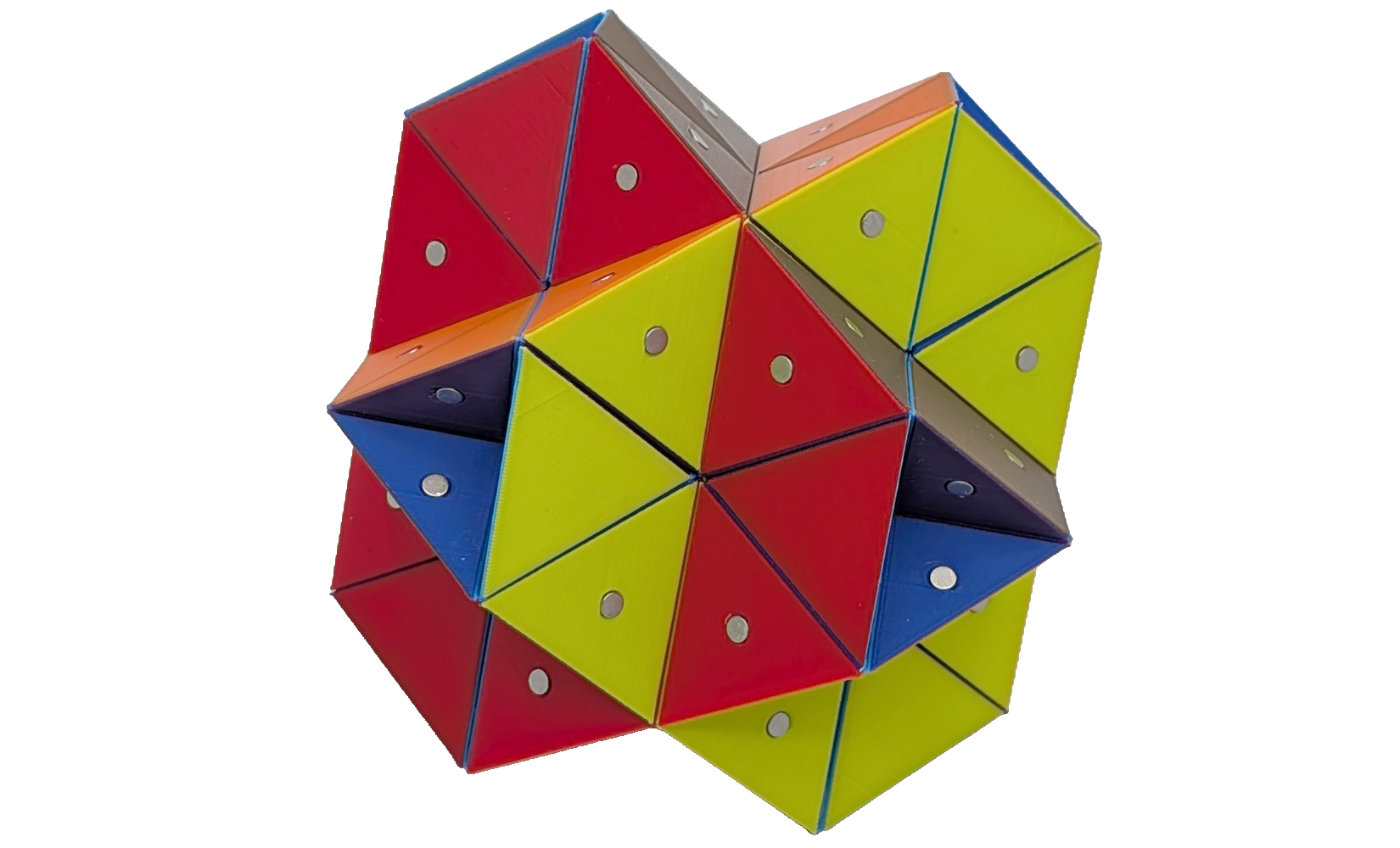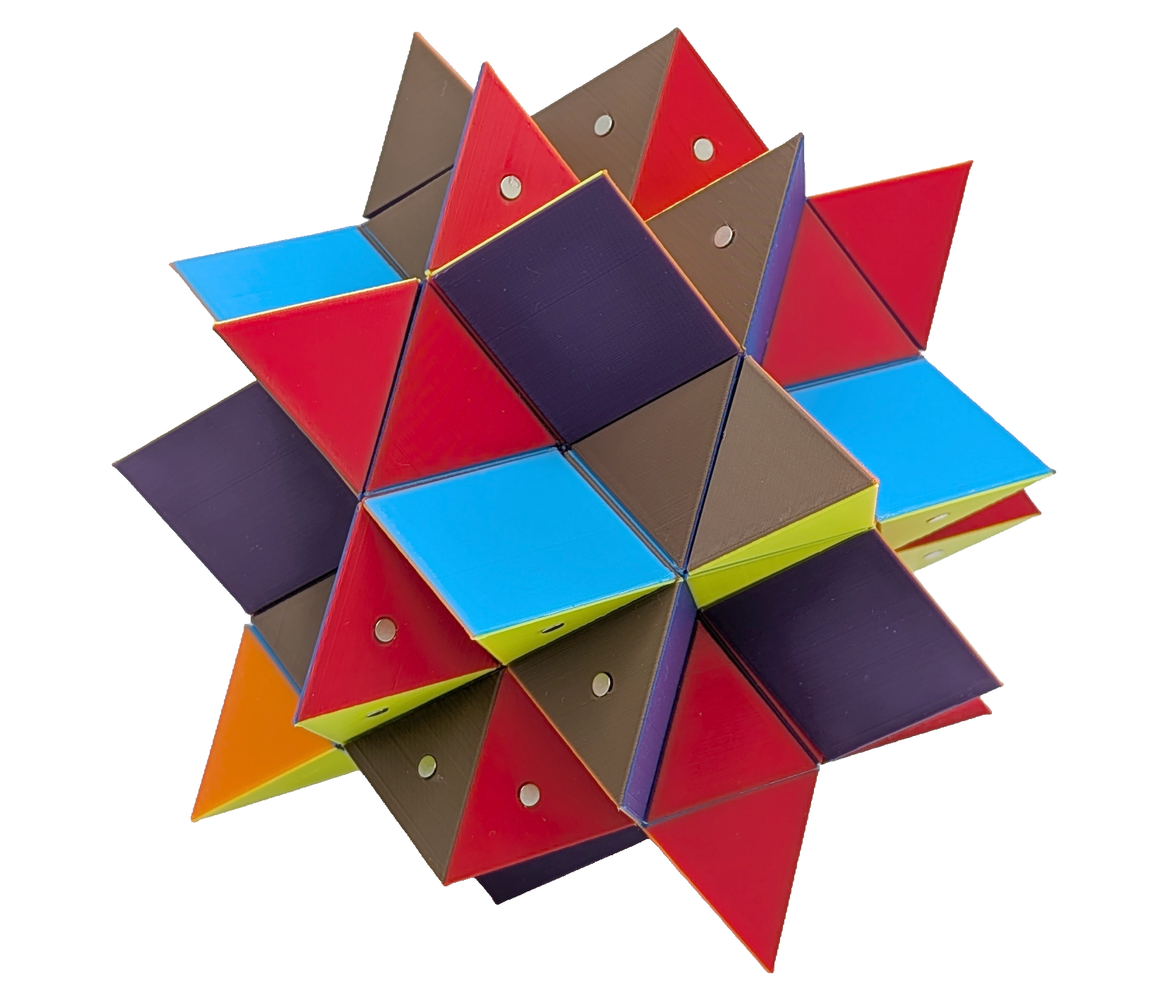 Constructing models for all stellations requires seven types of building blocks, if one does not considers face-colouring. In my implementation, all parallel faces share a unique colour, resulting in seven different colours. By this, nearly all coloured blocks are unique. The OpenSCAD designs for the kernel, type 1 blocks, type 2 blocks, type 3 blocks, type 4 blocks, type 5 blocks, type 6 blocks and type 7 blocks are ready to be sliced and 3D printed. Once all the magnets are put in place, all stellations can be built, for instance by following: