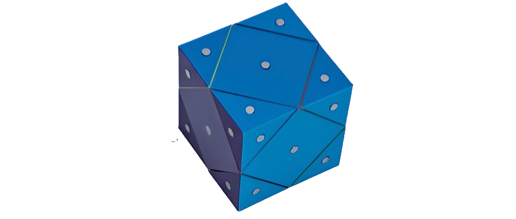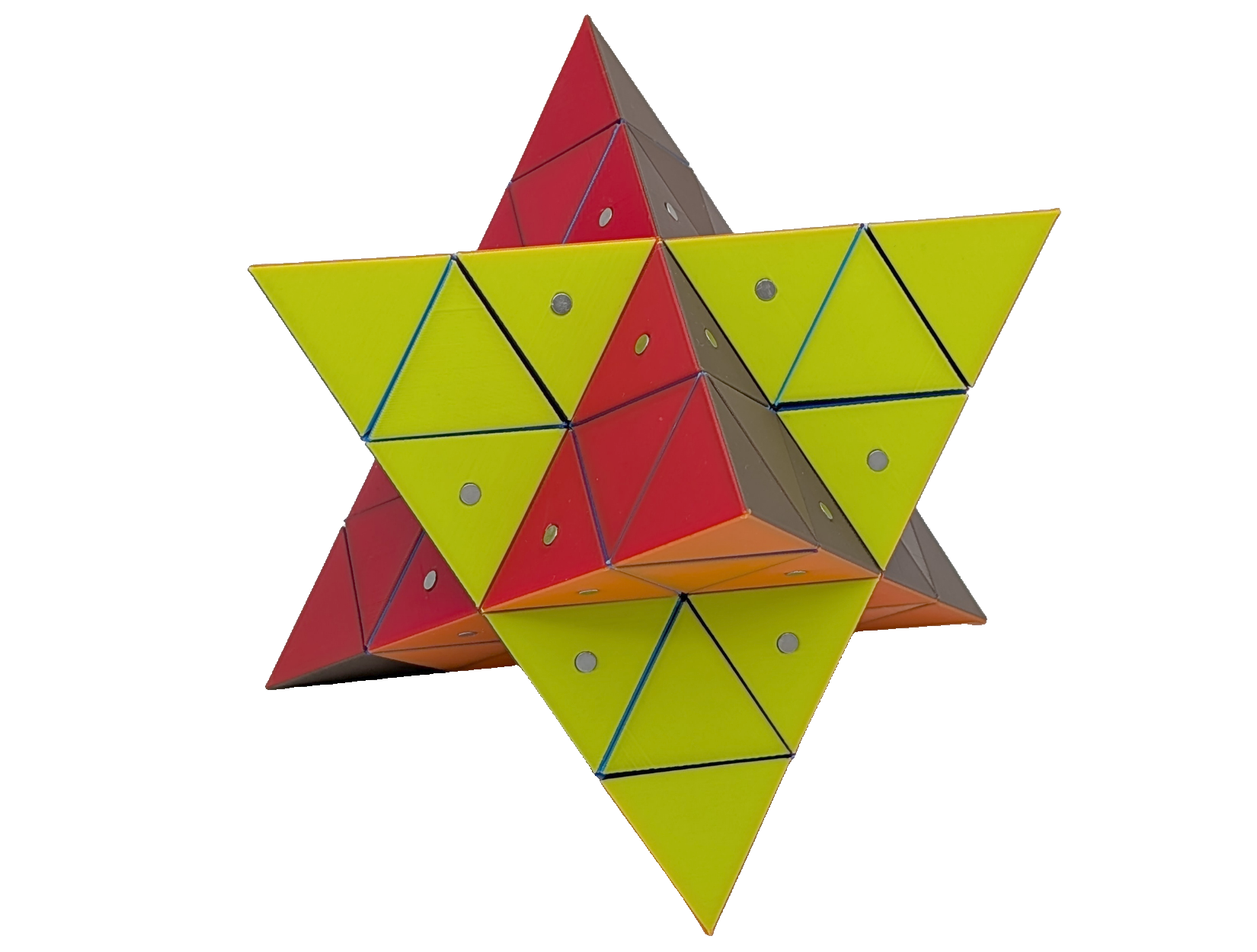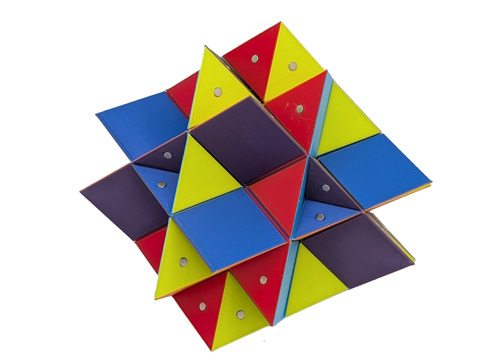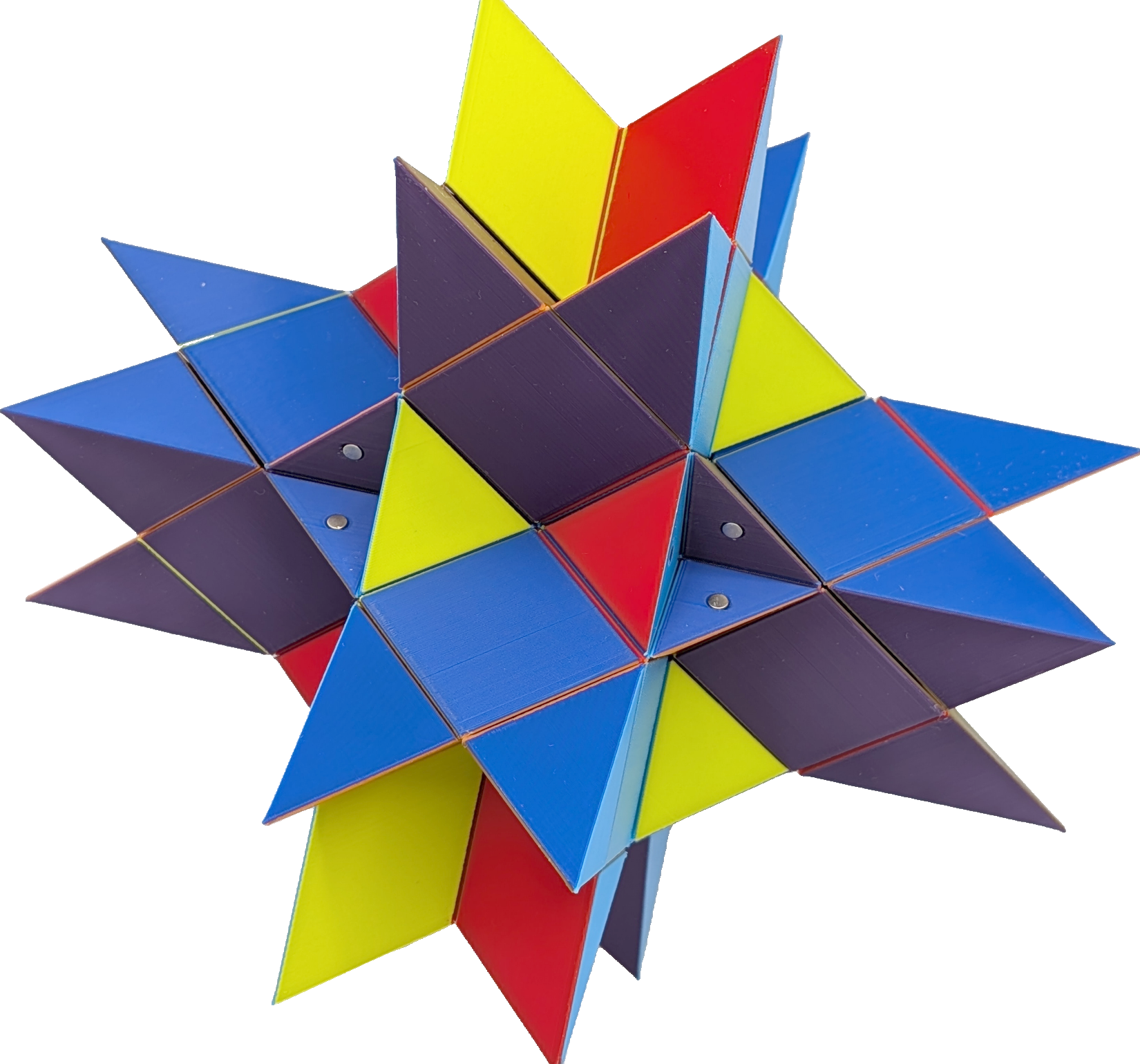 Constructing models for all stellations requires seven types of building blocks, if one does not considers face-colouring. In my implementation, all parallel faces share a unique colour, resulting in seven different colours. By this, nearly all coloured blocks are unique. The OpenSCAD designs for the kernel, type 1 blocks, type 2 blocks, type 3 blocks, type 4 blocks, type 5 blocks, type 6 blocks and type 7 blocks are ready to be sliced and 3D printed. Once all the magnets are put in place, all stellations can be built, for instance by following: